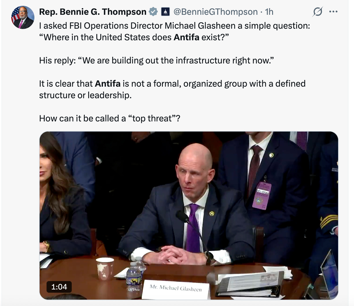 Case in point, FBI Operations Director Michael Glasheen couldn’t answer Rep. Thompson’s basic question, “Where in the United States does Antifa exist if it’s a terrorist organization and you’ve identified it as number one?” Glasheen responded like a deer in headlights, clearly unable to improvise in real time and come up with a lie that can be used by Fox to gaslight the rest of America.