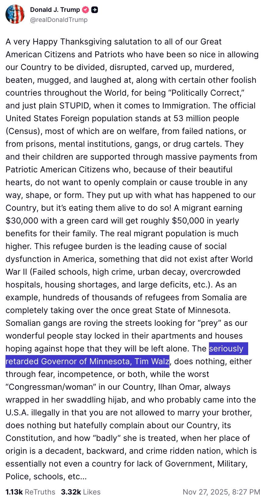 Instead of being a normal human being who wishes people a happy Thanksgiving and spends time with his family, Trump decided to post a long, rambling, dangerous, hateful rant against immigrants and people of color. He’s such a deranged freak. Try not to vomit after reading this post.