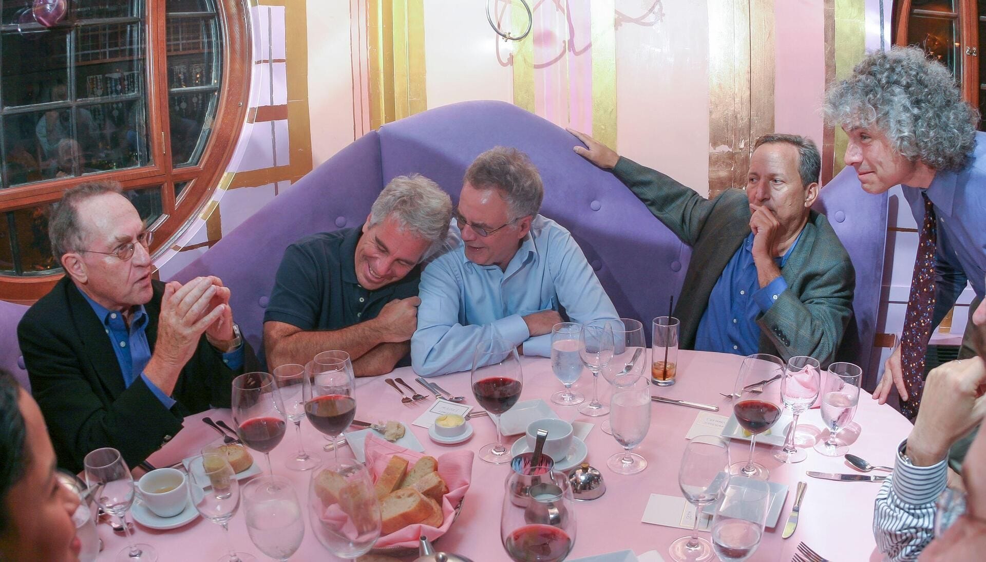 (Jeffrey Epstein (2nd from left) at a dinner he hosted at Harvard, September 2004 with (l-r) professors Alan Dershowitz, Robert Trivers, Lawrence Summers (formerly Secretary of the Treasury and Harvard President) and Stephen Pinker. Photo: Rick Friedman / Alamy)