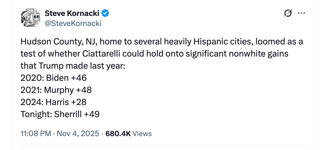 Tuesday’s election was a sneak preview, according to Mike Madrid, co-founder of The Lincoln Project, who has been following Latino American voter trends for nearly 30 years. He’s the one who predicted that Latino voters would go back to 2016 numbers and is looking at the post-election data and predicting an utterly brutal 2026 midterms for Republicans who are on the verge of losing Georgia and North Carolina. Madrid also says the polls reveal the Democratic strategy of retaining “The blue wall” of the Rust Belt should be replaced by courting voters of color in Nevada, Arizona, Georgia, and even parts of Texas.