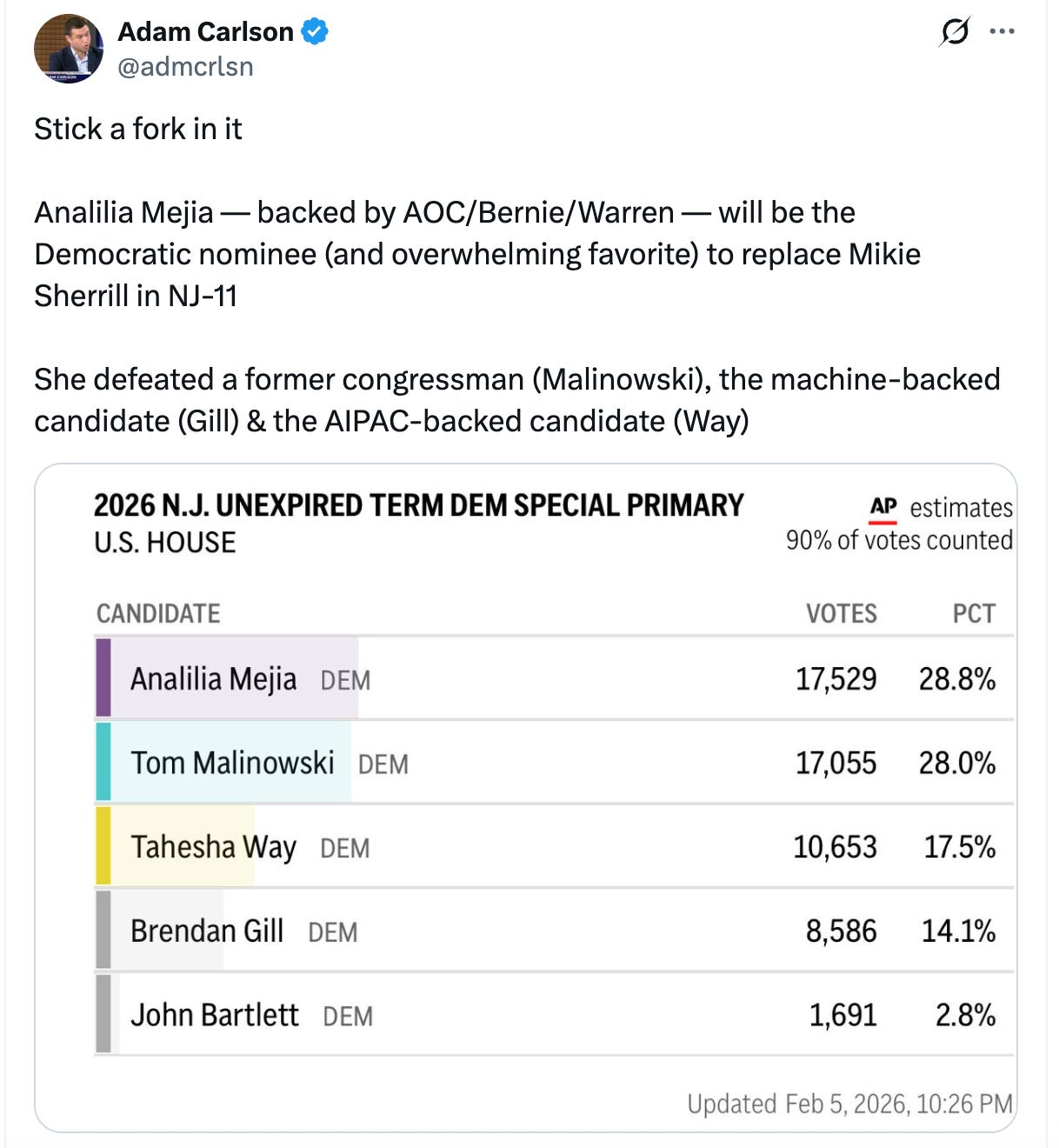 Last night, Anelilia Mejia, a progressive Latina who is pro-Palestine, anti-genocide, and firmly in the Abolish ICE camp, just won a shocker. If the numbers hold, she’ll be the Democratic candidate to replace Governor Sherrill’s seat in the affluent, suburban, allegedly “centrist” NJ-11 district.