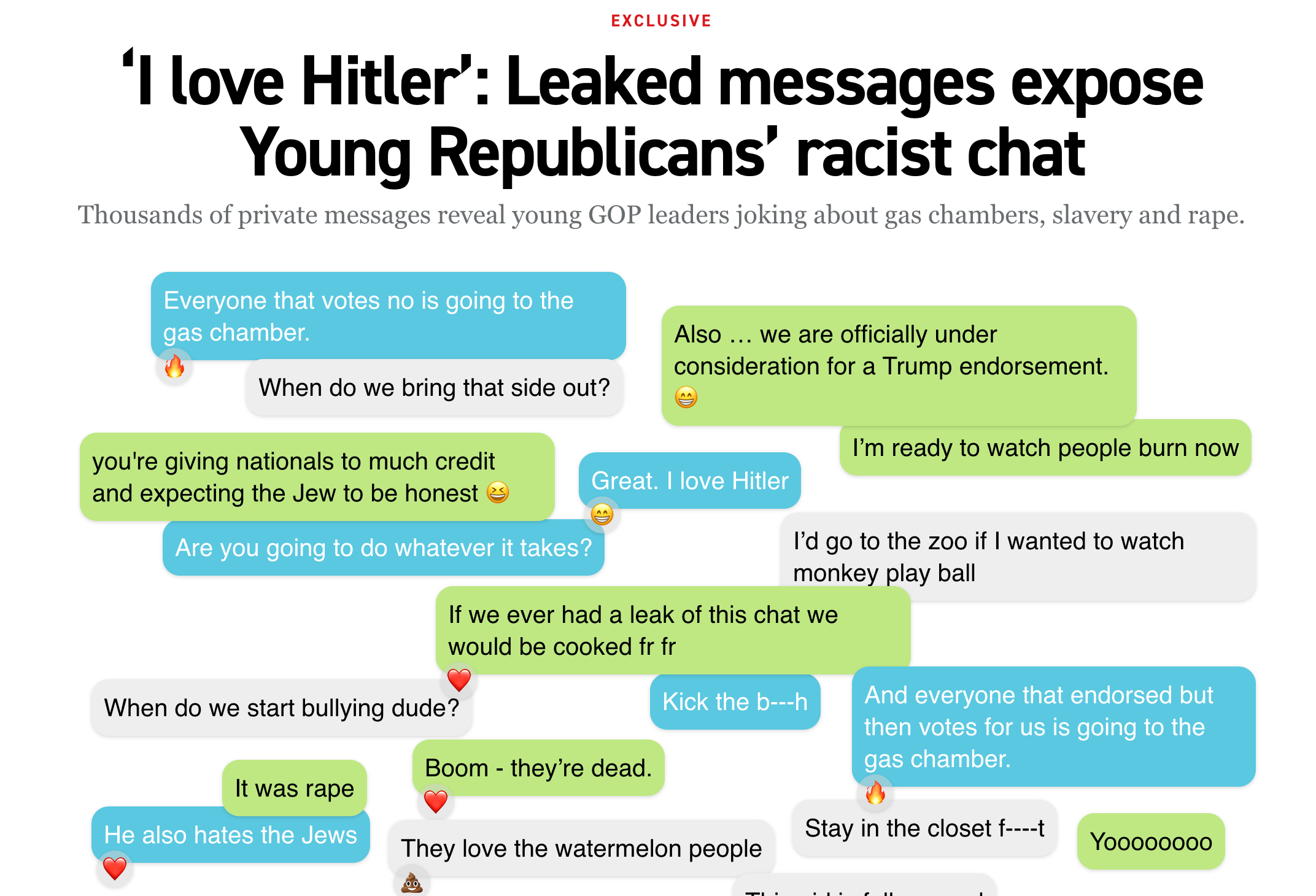 I don’t know about you, but I’ve never typed or said, “I love Hitler” during periods of economic anxiety in my life. I also didn’t repeatedly use variations of the N word multiple times in a group chat. I also did not wish to throw my enemies into gas chambers or delight in imagining torturing them. Then again, I’m not a Young Republican leader.