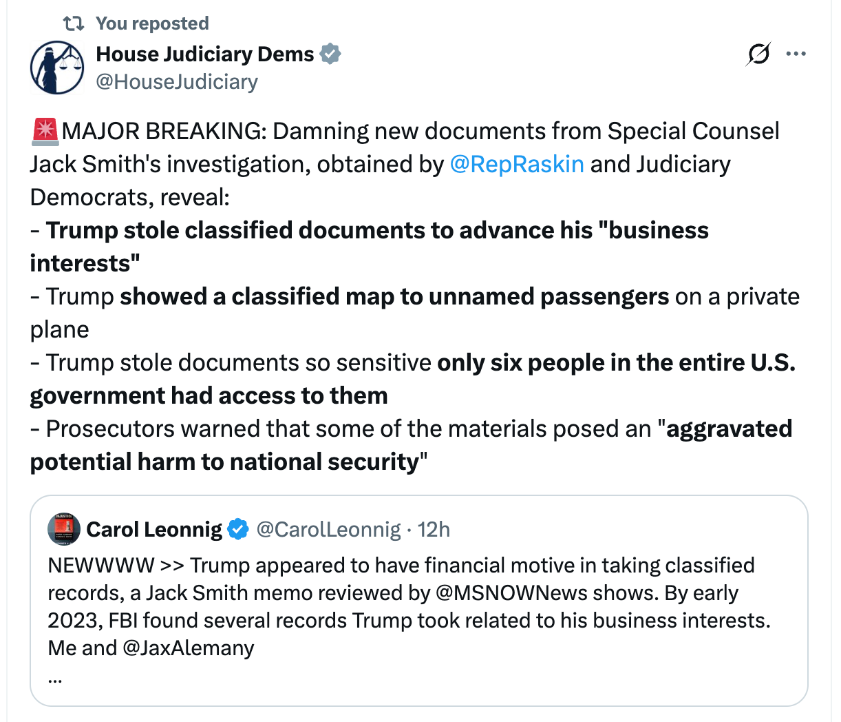 With this news in mind, are you at all surprised by the latest revelations from the House Judiciary Committee that Donald Trump stole classified documents that compromised our national security and advanced “his business interests?”