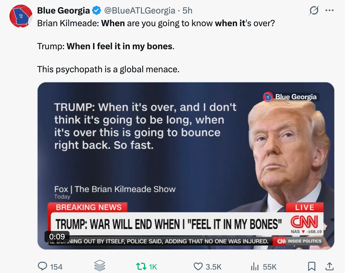 The markets are swinging due to the uncertainty, volatility, and insecurity brought on by the war and Iran’s choking of the Strait of Hormuz, leading to the biggest oil supply disruptions in history. But, Trump and Pete Kegseth are still projecting strength and cosplaying as tough guys. When asked when the war would end, Trump replied, “When I feel it in my bones.” He meant to say bone spurs.
