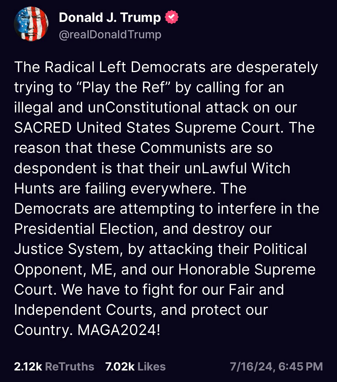Meanwhile, Trump was already declared winner of an election nearly 4 months away because of a photo of him raising his fist after surviving a shooting. That photo was quickly replaced with a photo of him walking into the RNC with a giant, goofy, white bandage over his entire ear. There were other images of him falling asleep during the proceedings. The image that sticks with me however is when the entire RNC crowd, led by Trump and GOP leaders on the stage, pumped their fists and chanted, “Fight! Fight! Fight!” I don’t know about you, but that certainly filled my heart with calm, serenity, and peace especially when I remember that many of these individuals support the Jan 6 insurrection and endorse Project 2025. In case there was any doubt of Trump pivoting to unity, he squashed all hopes on Tuesday night when he posted a message blasting the “Radical Left Democrats” and calling them “Communists” for engaging in a “Witch Hunt” among other claims of fanciful imagination.